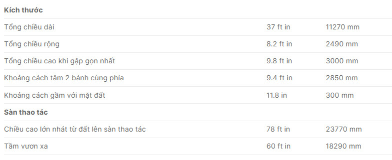 – Chiều cao nâng sàn tối đa: 26m